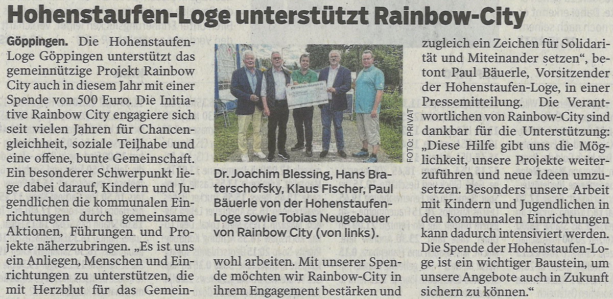 Göppingen, 02.09.2025 - Die Hohenstaufen-Loge hat erneut ihr soziales Engagement unter Beweis gestellt und die Initiative Rainbow-City mit einer großzügigen Spende unterstützt.Mit dieser Zuwendung möchte die Loge einen aktiven Beitrag dazu leisten, die wertvolle Arbeit der Organisation zu fördern.